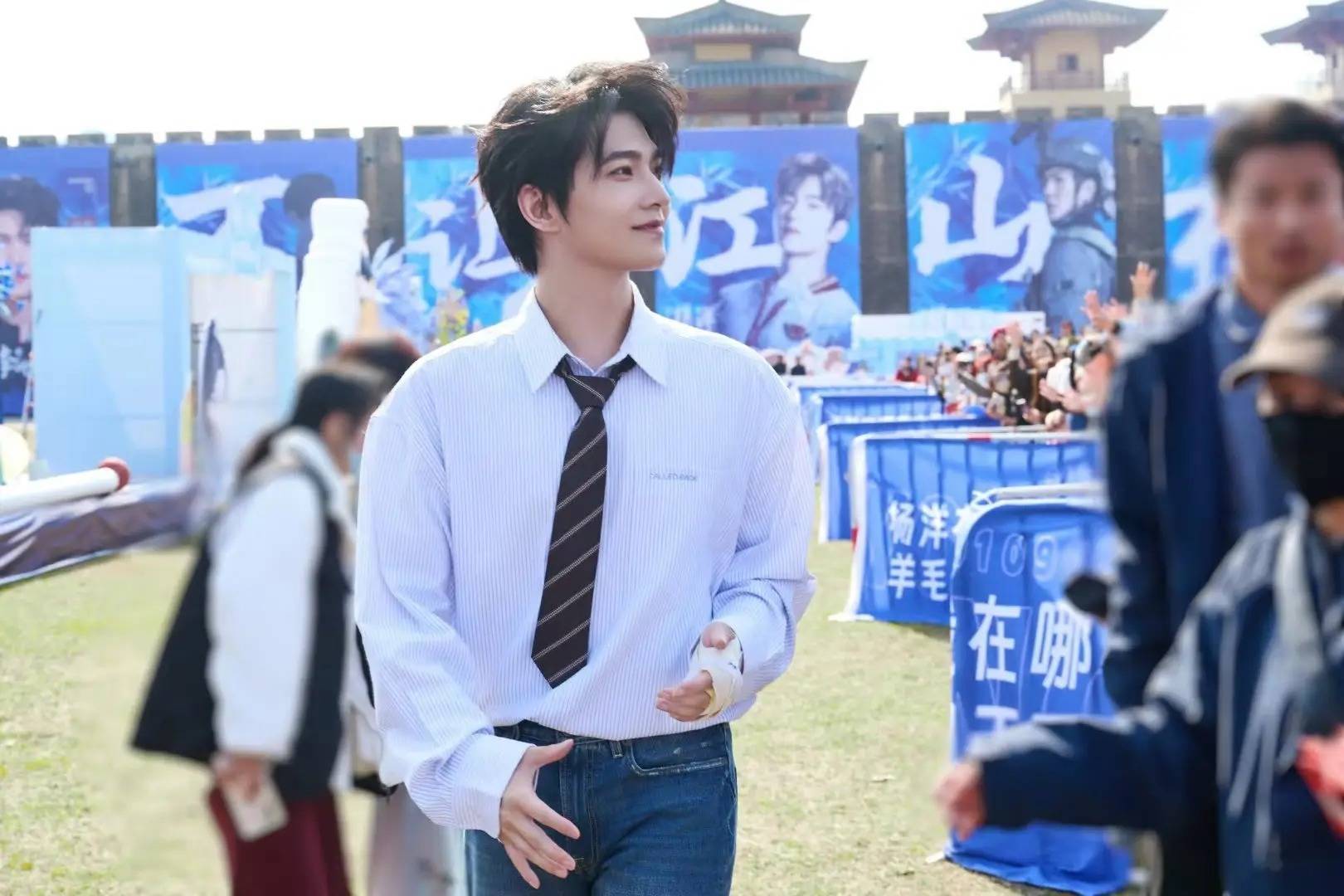 左手缠着绷带或夹板,行动受限,杨洋仍坚持出席了《不让江山》的全部开机流程,包括上香、互动游戏、为粉丝发放红包等环节。他在现场多次叮嘱粉丝注意天气变化和路途安全,反以温暖话语安抚他人,被粉丝称为“伤者反安慰他人”的温柔担当。