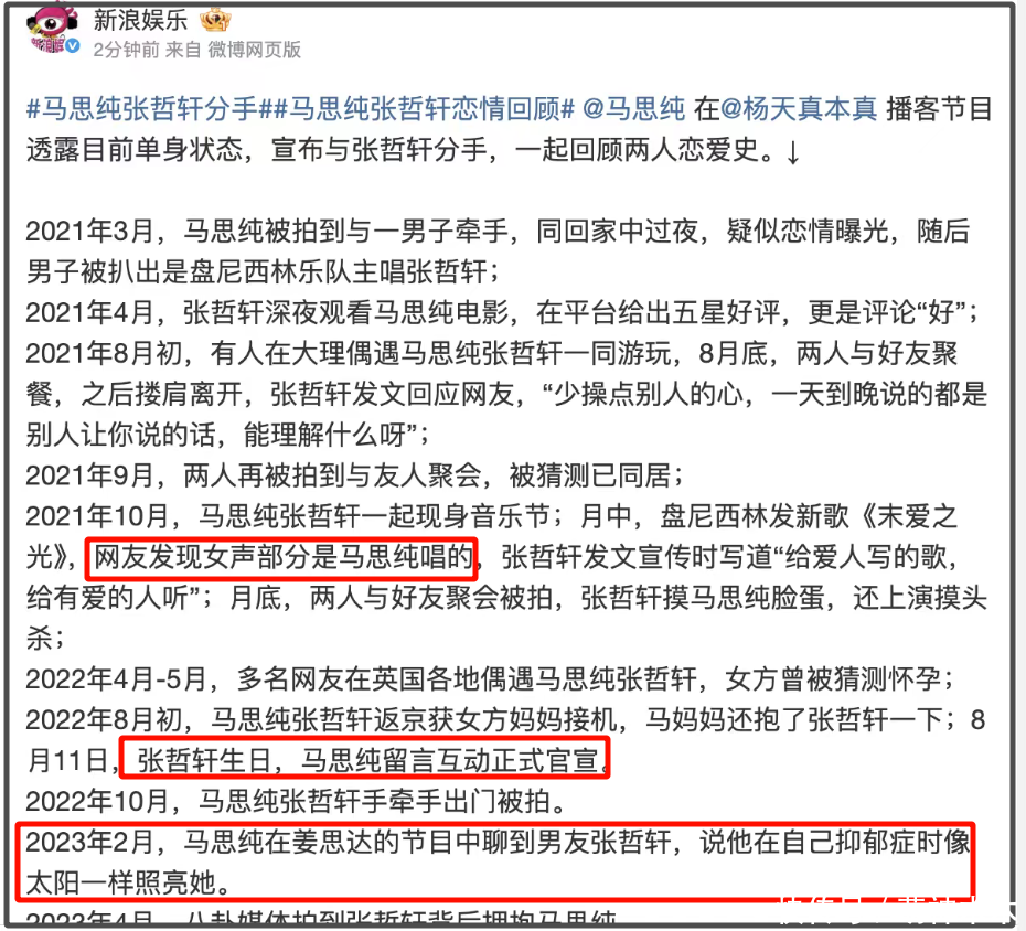 后续两人分手,马思纯差点一蹶不振,在那之后很少有作品出来。后来和张哲轩恋爱,更是被批“恋爱脑”,甚至传出怀孕的传闻。