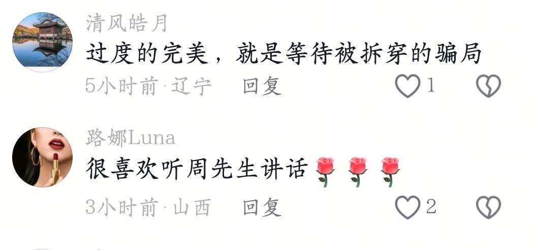 一时间,“娱乐圈清流”“清醒独立之人”“值得尊敬的榜样”等称号纷至沓来,他发布的每段视频评论区都充斥着崇拜与共鸣。